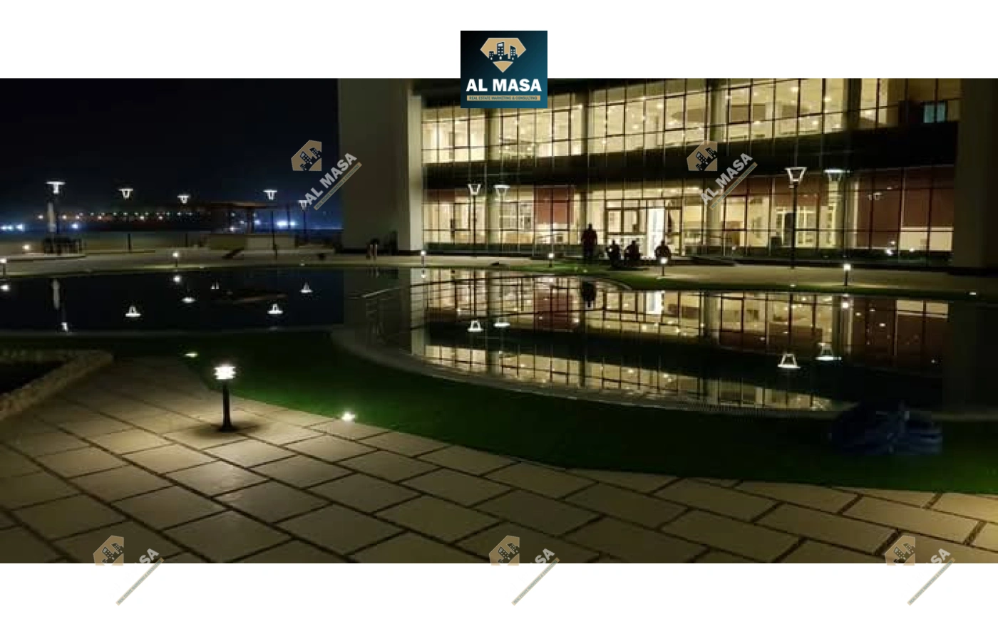وتحتوى الحديقه على كنب تم بناءة وترابيزات و بار و رامب رخام.